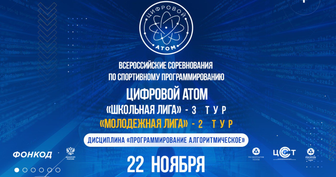 Центр современных спортивных технологий Концерна Росэнергоатом и проект «Фонкод» объявляют о стартах 2 тура Второго сезона Всероссийской МОЛОДЕЖНОЙ ЛИГИ и 3 тура ШКОЛЬНОЙ ЛИГИ спортивного программирования «Цифровой атом», которые пройдут 22 ноября.